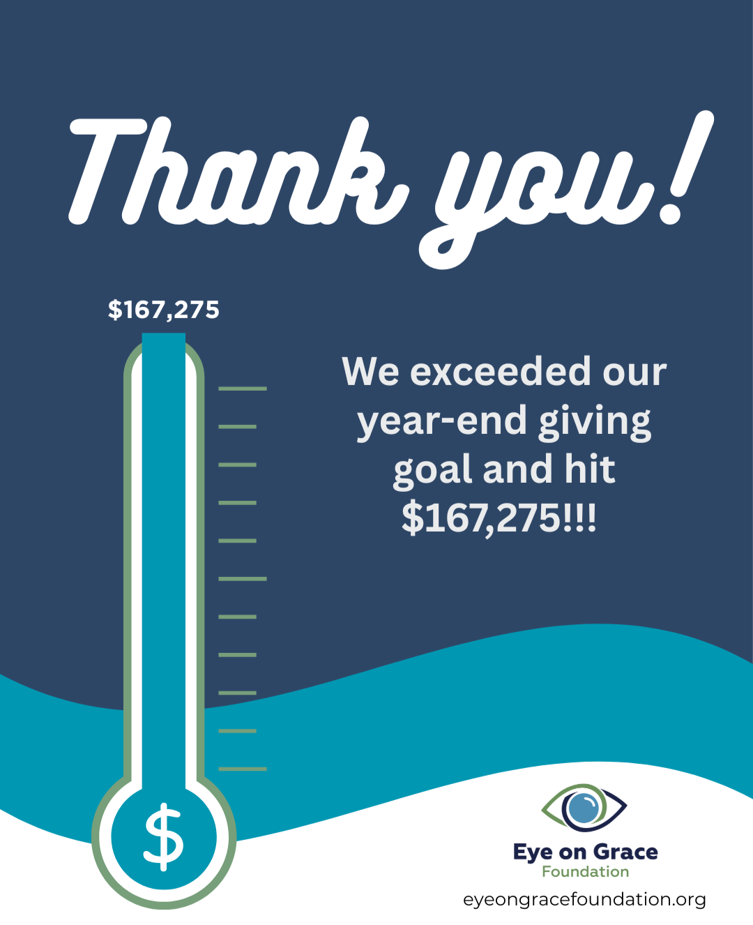 Thanks to your generosity, Eye on Grace ended 2025 in epic fashion! We exceeded our $150,000 fundraising goal, finishing at 167,275! Your generosity directly provides flights, lodging, gas, and caregiver support for families facing overwhelming medical journeys. Thank you for giving hope, giving grace, and helping patients access the care they need most.