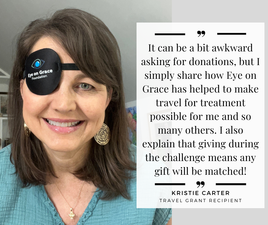 “It can be a bit awkward asking for donations, but I simply share how Eye on Grace has helped to make travel for treatment possible for me and so many others. I also explain that giving during the challenge means any gift will be matched!