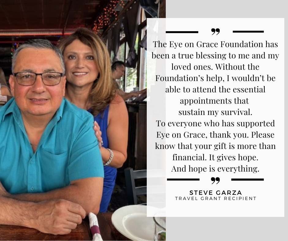 The Eye on Grace Foundation has sponsored multiple trips in 2025 for Steve Garza, who was diagnosed with ocular melanoma after a routine eye exam. Steve travels from his home in San Antonio to Houston and Philadelphia for treatment. This is Steve’s story: